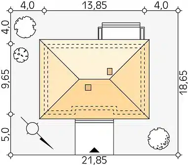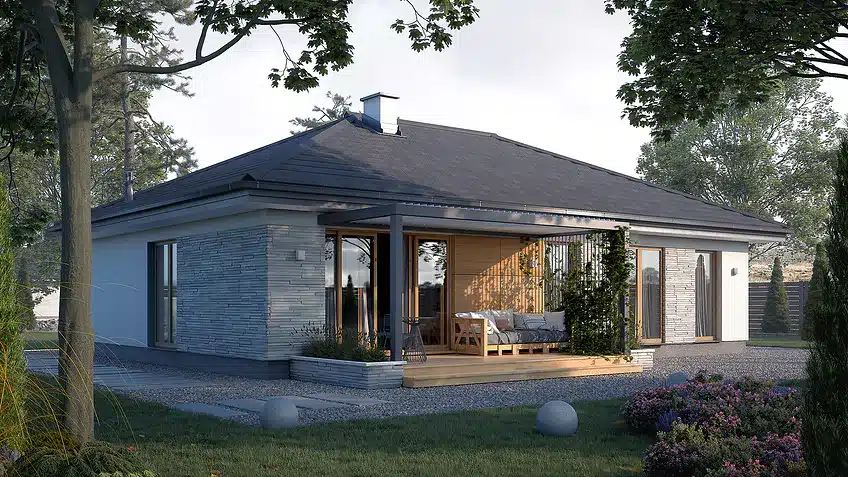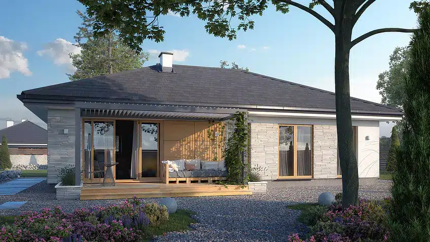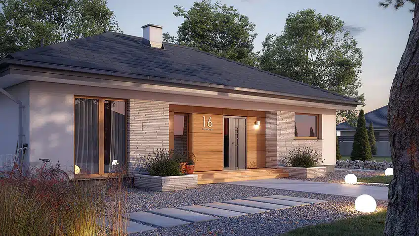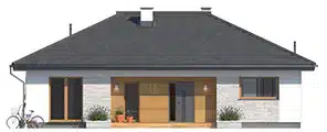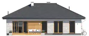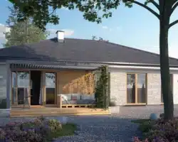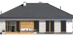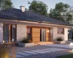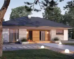 Avocado ist ein Entwurf für ein einstöckiges Haus, das den Bedürfnissen einer 3-4-köpfigen Familie gerecht wird. Der Nutzungsplan wurde in zwei Bereiche unterteilt. Der Wohnbereich besteht aus einem geräumigen großen Wohnzimmer mit Essbereich und einer offenen Küche mit Speisekammer. Im Schlafbereich sind drei Schlafzimmer vorgesehen. Eines davon ist das Elternschlafzimmer. Es verfügt über ein eigenes Bad und einen Kleiderschrank, was ein großer Vorteil des Entwurfs ist. Die beiden anderen Schlafzimmer sind für Kinder oder Gäste vorgesehen. Im Gemeinschaftsbereich befinden sich ein Badezimmer und ein Hauswirtschaftsraum. Die Materialauswahl für die Fassade verleiht dem Haus einen einheitlichen und modernen Charakter. Avocado ist ein energieeffizientes Projekt, das sich ideal für Grundstücke mit Zufahrt von Norden eignet.