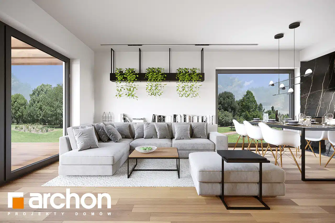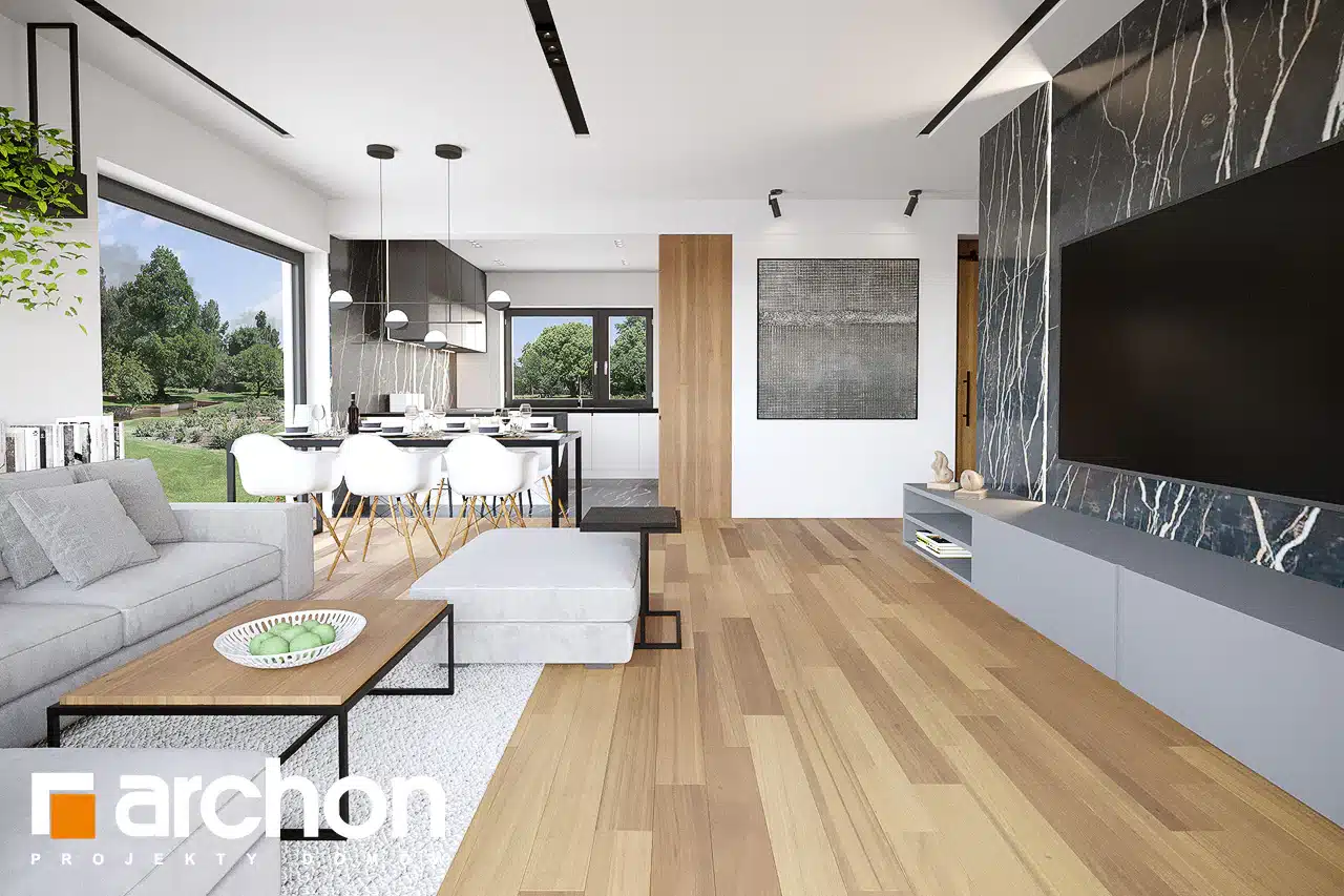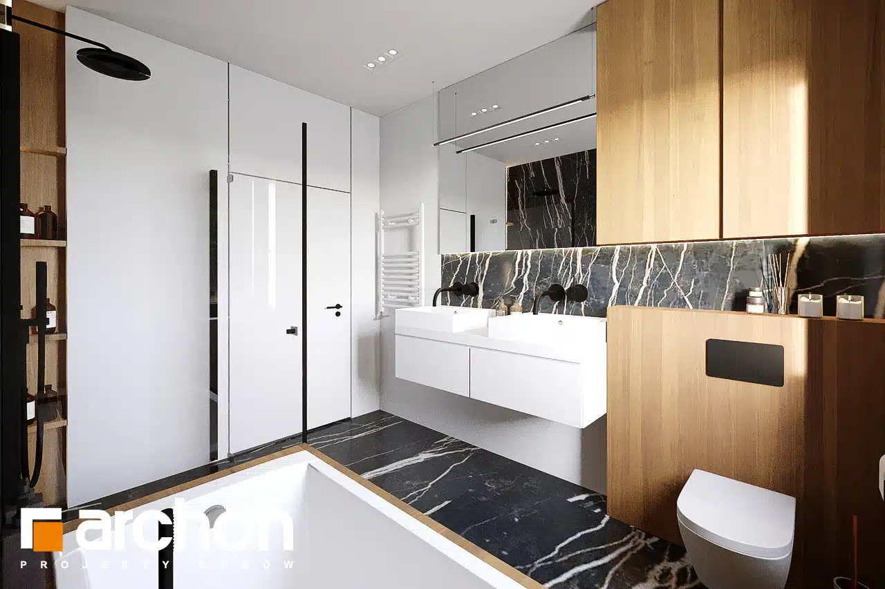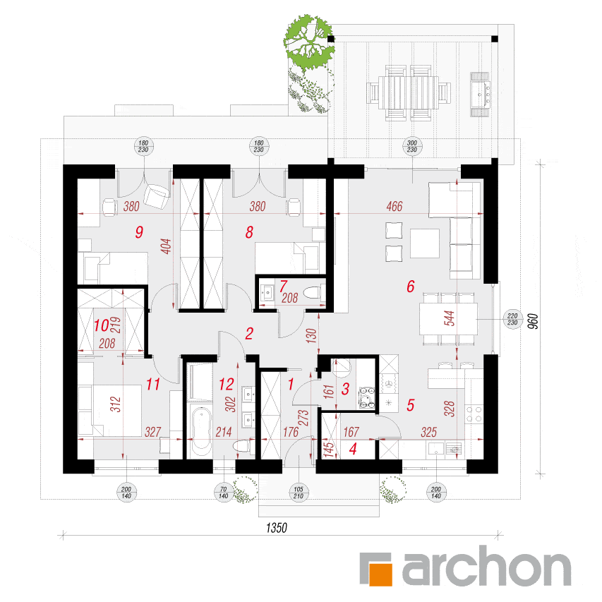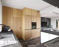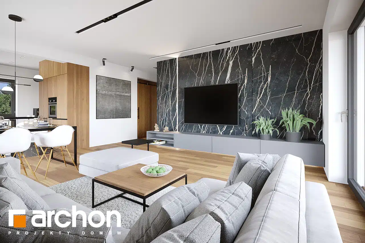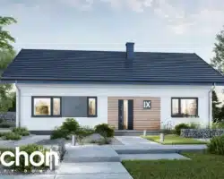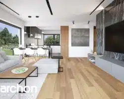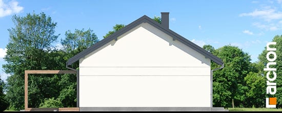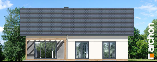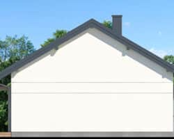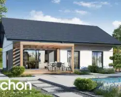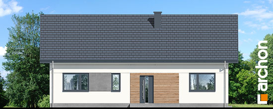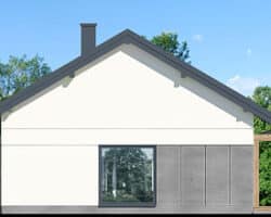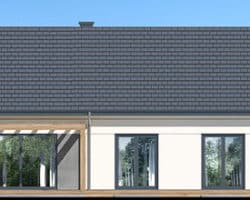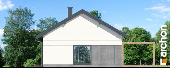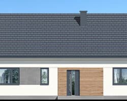 Ein modernes Projekt eines kleinen einstöckigen Hauses mit einer einfachen Form, das standardmäßig über eine mechanische Belüftung verfügt. Die stilvolle Außenverkleidung basiert auf einer gedeckten Farbpalette und kombiniert hellen und graphitfarbenen Putz mit einer Holzverkleidung in warmen Farbtönen. Das Satteldach ist mit anthrazitfarbenem Falzblech gedeckt, das einen effektvollen Kontrast zum weißen Putz bildet. Die zarte Bossenverkleidung des Putzes und die durchbrochene Holzpergola über der Terrasse schmücken das Haus. Der Vorteil der funktionalen Anordnung ist die optimale Nutzung der verfügbaren Nutzfläche und die klare Aufteilung in einen Wohn- und einen Schlafbereich, was den Bewohnern komfortable Wohnbedingungen garantiert. Im komfortablen Wohnbereich wurden ein Wohnzimmer, ein Esszimmer mit einem großen Tisch und eine offene Küche entworfen, deren konventionelle Grenze durch eine Halbinsel mit Frühstückstheke markiert wird. Die an die Küche angrenzende Speisekammer erleichtert die Lagerung von Lebensmitteln oder kleinen Haushaltsgeräten. Die verschiebbare Terrassentür verbindet den Wohnbereich nahtlos mit dem Garten, und die gemütliche Terrasse mit Pergola wird an Sommertagen zum Lieblingsplatz für Entspannung im Freien. In einem separaten Teil des Hauses befindet sich der private Schlafbereich. Hier finden wir das Elternschlafzimmer mit eigenem Kleiderschrank, zwei Kinderzimmer und ein gemeinsames Badezimmer mit Badewanne, Dusche und zwei Waschbecken. In den Kinderzimmern ist Platz für geräumige Wandschränke und Schreibtische oder Regale vorgesehen. Das Hausprogramm wird durch eine Toilette und einen Heizungsraum mit Gasofen ergänzt, der gleichzeitig als Waschküche dient.
