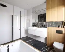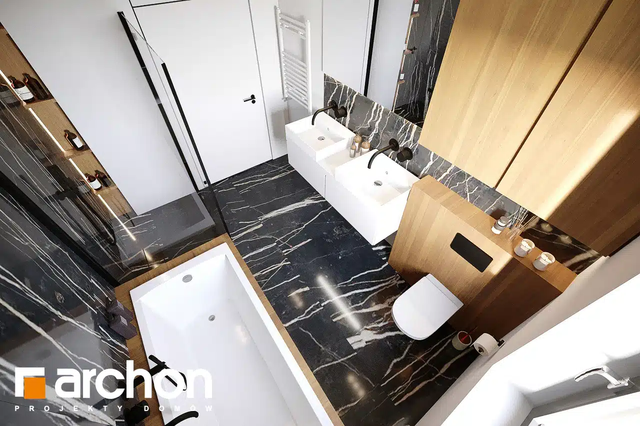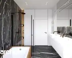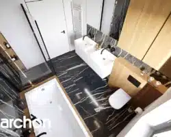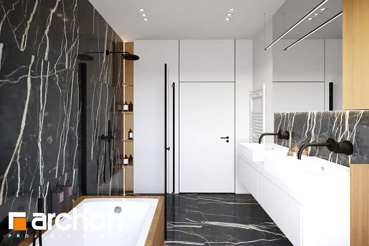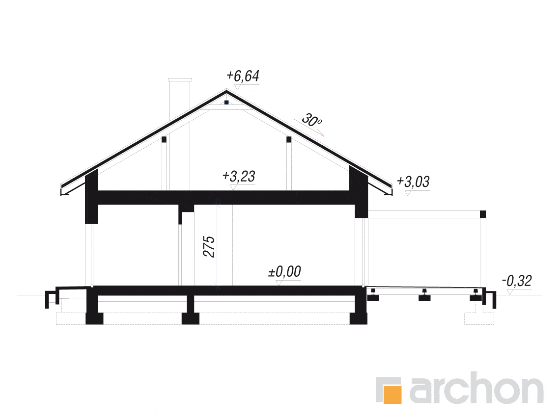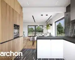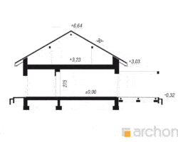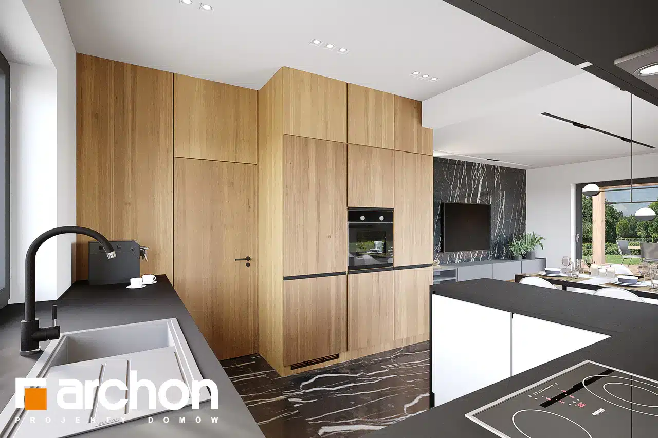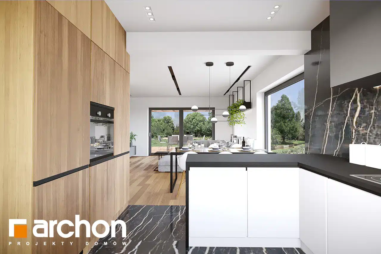 Ein modernes Projekt eines kleinen einstöckigen Hauses mit einer einfachen Form, das standardmäßig über eine mechanische Belüftung verfügt. Die stilvolle Außenverkleidung basiert auf einer gedeckten Farbpalette und kombiniert hellen und graphitfarbenen Putz mit einer Holzverkleidung in warmen Farbtönen. Das Satteldach ist mit anthrazitfarbenem Falzblech gedeckt, das einen effektvollen Kontrast zum weißen Putz bildet. Die zarte Bossenverkleidung des Putzes und die durchbrochene Holzpergola über der Terrasse schmücken das Haus. Der Vorteil der funktionalen Anordnung ist die optimale Nutzung der verfügbaren Nutzfläche und die klare Aufteilung in einen Wohn- und einen Schlafbereich, was den Bewohnern komfortable Wohnbedingungen garantiert. Im komfortablen Wohnbereich wurden ein Wohnzimmer, ein Esszimmer mit einem großen Tisch und eine offene Küche entworfen, deren konventionelle Grenze durch eine Halbinsel mit Frühstückstheke markiert wird. Die an die Küche angrenzende Speisekammer erleichtert die Lagerung von Lebensmitteln oder kleinen Haushaltsgeräten. Die verschiebbare Terrassentür verbindet den Wohnbereich nahtlos mit dem Garten, und die gemütliche Terrasse mit Pergola wird an Sommertagen zum Lieblingsplatz für Entspannung im Freien. In einem separaten Teil des Hauses befindet sich der private Schlafbereich. Hier finden wir das Elternschlafzimmer mit eigenem Kleiderschrank, zwei Kinderzimmer und ein gemeinsames Badezimmer mit Badewanne, Dusche und zwei Waschbecken. In den Kinderzimmern ist Platz für geräumige Wandschränke und Schreibtische oder Regale vorgesehen. Das Hausprogramm wird durch eine Toilette und einen Heizungsraum mit Gasofen ergänzt, der gleichzeitig als Waschküche dient.