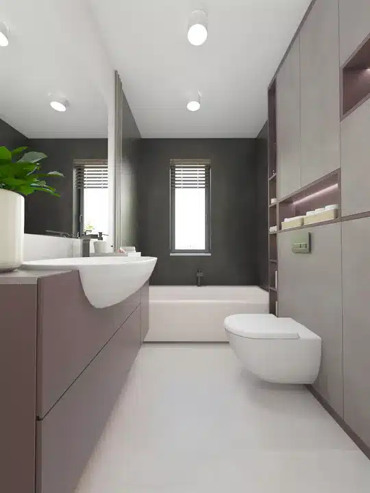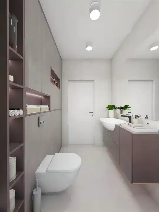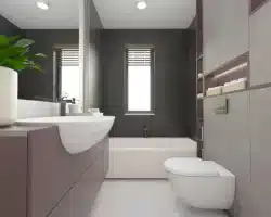 Gleich hinter der Eingangstür empfängt ein Windfang mit einem perfekt abgetrennten Platz für eine Garderobe die Bewohner und Gäste. Direkt dahinter befindet sich das Badezimmer, das den Wohnbereich vom Schlafbereich trennt. Neben dem Schlafbereich befindet sich ein Hauswirtschaftsraum, der sich hervorragend als Wasch- und Trockenraum oder Abstellraum eignet.