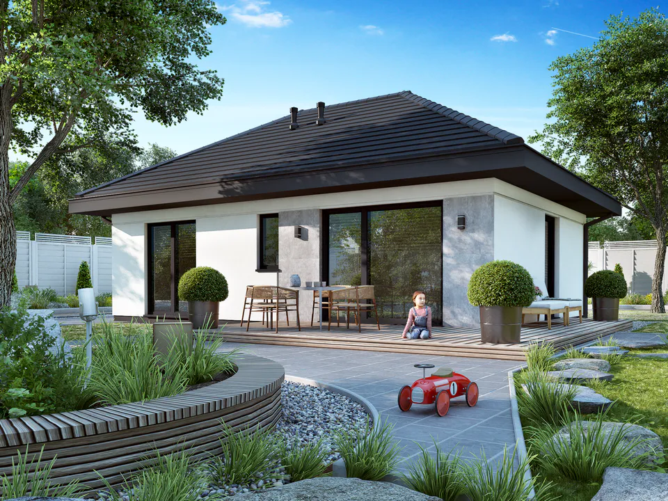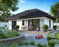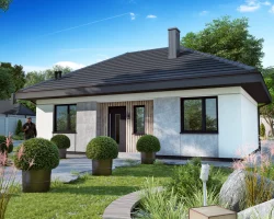 Wir präsentieren Ihnen das Hausprojekt Ka251 – ein modernes, einstöckiges Haus mit einer Wohnfläche von 52,04 m², ideal für eine Familie mit zwei Kindern oder ein Paar. Der kompakte, rechteckige Grundriss wurde mit einem Walmdach mit einer Neigung von 30° gekrönt, was dem Gebäude ein elegantes und modernes Aussehen verleiht.