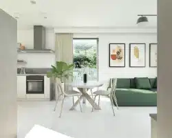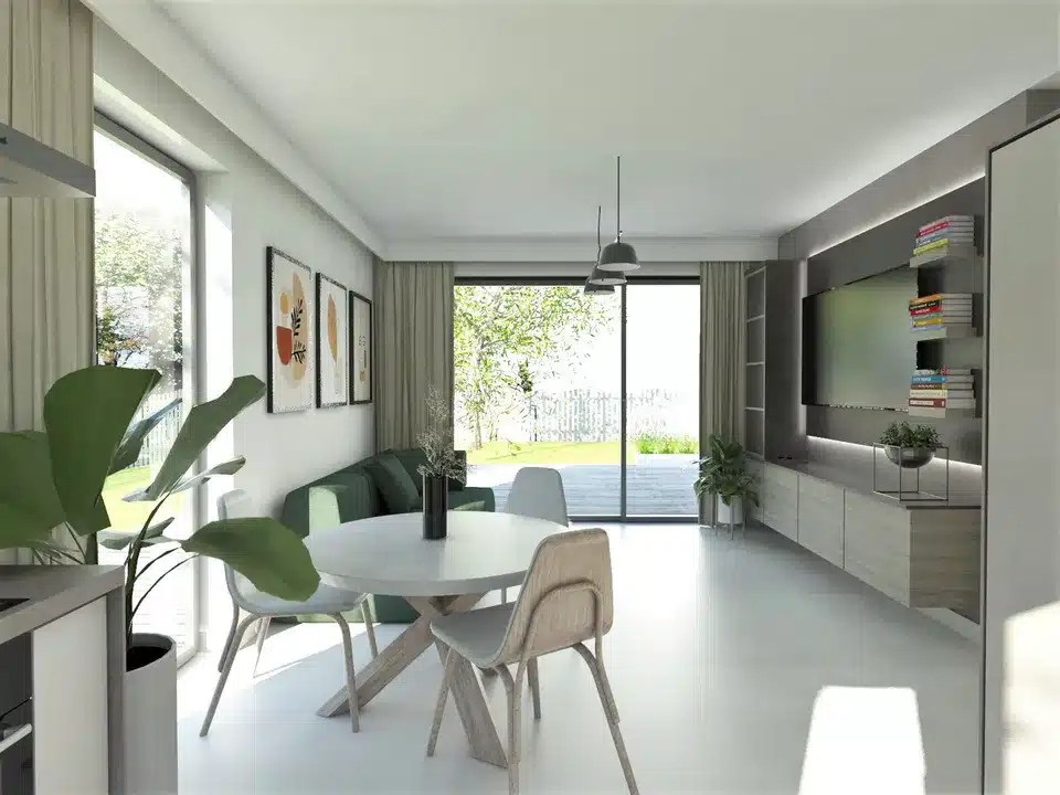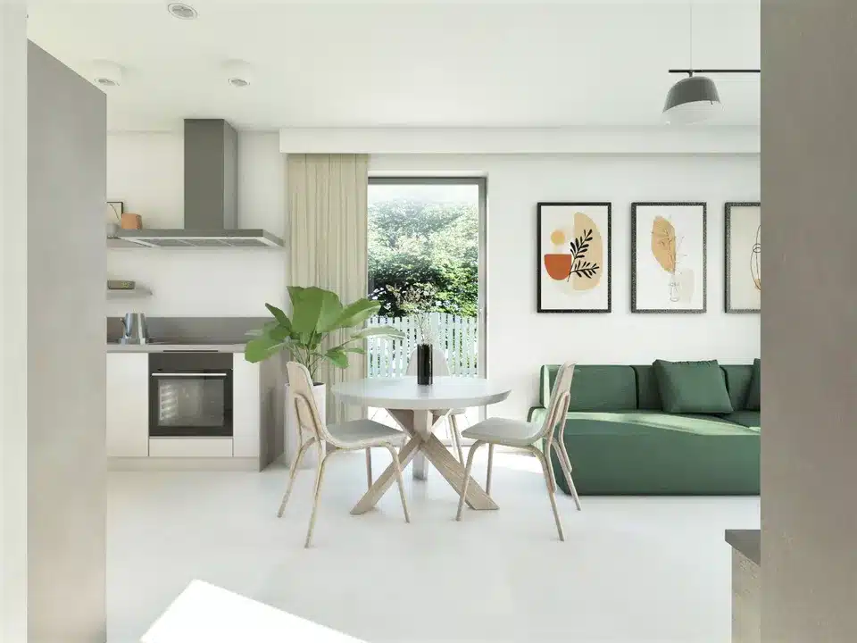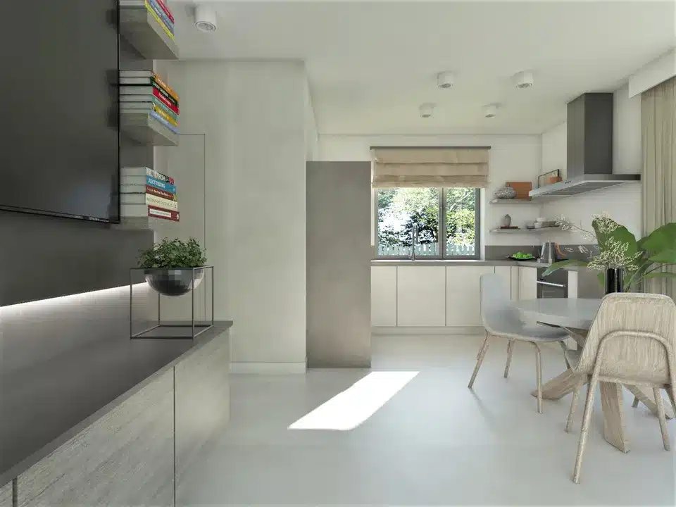 Wohnbereich: Das geräumige Wohnzimmer mit Essbereich und offener Küche schafft einen komfortablen Raum zum Verweilen.