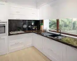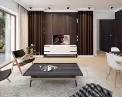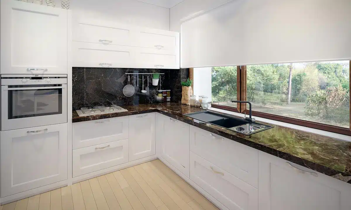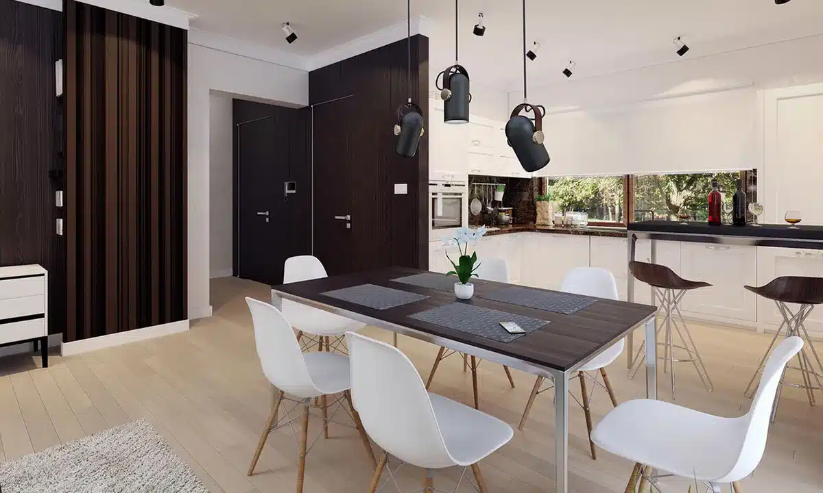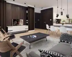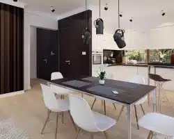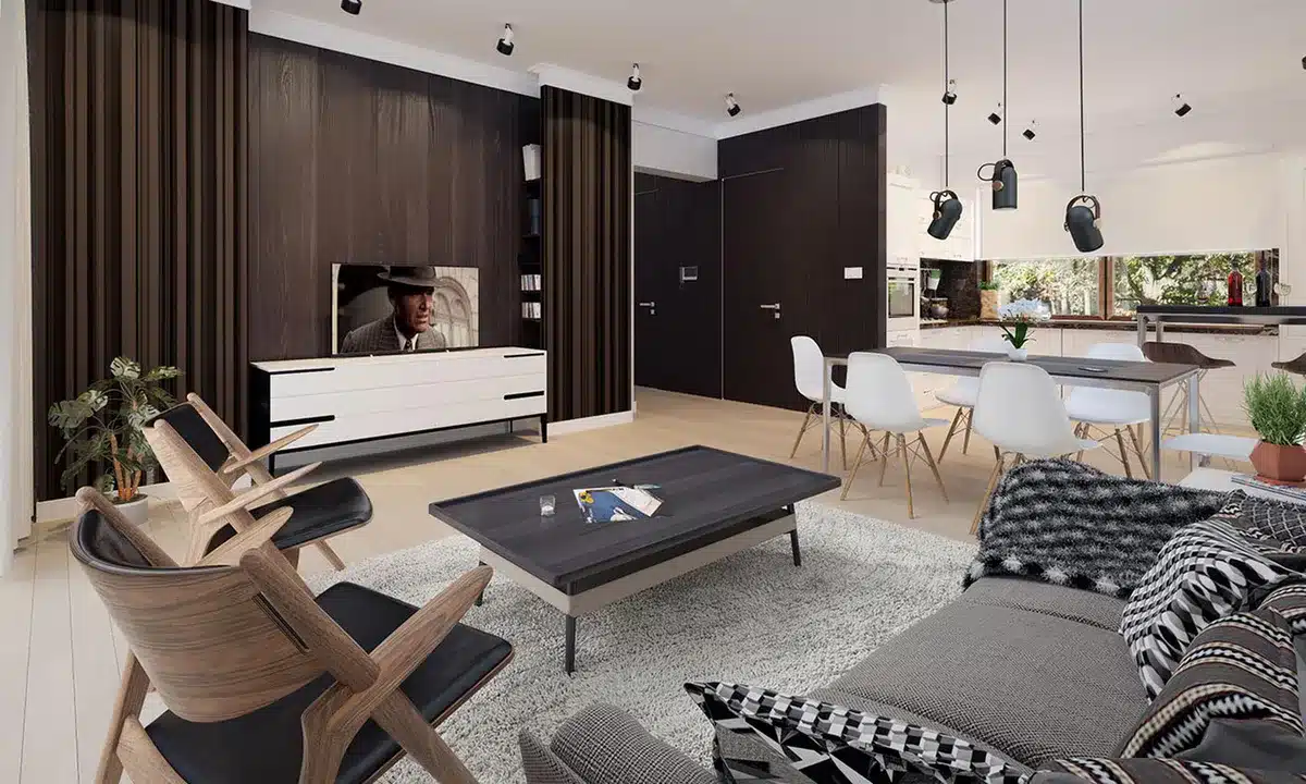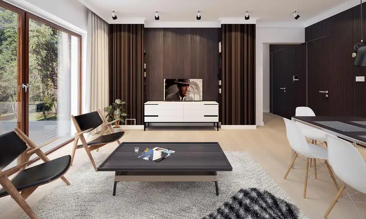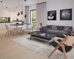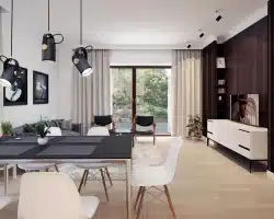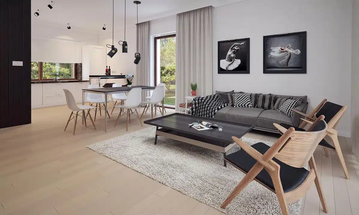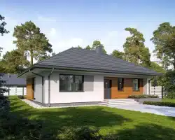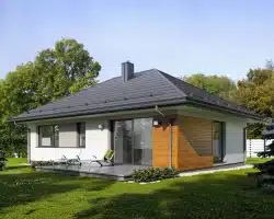 Lori drewniany ist ein Entwurf für ein einstöckiges Einfamilienhaus, das den optimalen Bedürfnissen einer 3-4-köpfigen Familie gerecht wird. Es handelt sich um ein sehr funktionales Haus mit einer klaren Aufteilung in verschiedene Bereiche. Der geräumige Wohnbereich ist eine einfache und klassische Kombination aus Wohnzimmer, Esszimmer und Küche, während der private Bereich aus 2 Schlafzimmern und einem Badezimmer besteht. Das Haus verfügt über eine große Terrasse, auf der man unabhängig von den Wetterbedingungen Zeit im Freien verbringen kann. Der Eingang zum Haus erfolgt über einen kleinen Vorbau, der vor Regen und Sonne schützt. Der Grundriss des Gebäudes ist rechteckig und mit einem Satteldach bedeckt. Diese Form des Gebäudes macht es einfach zu bauen und kostengünstig im Betrieb.