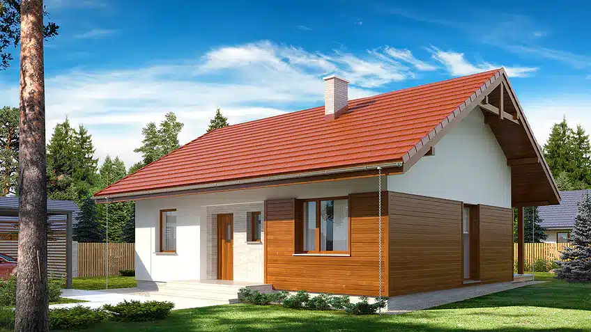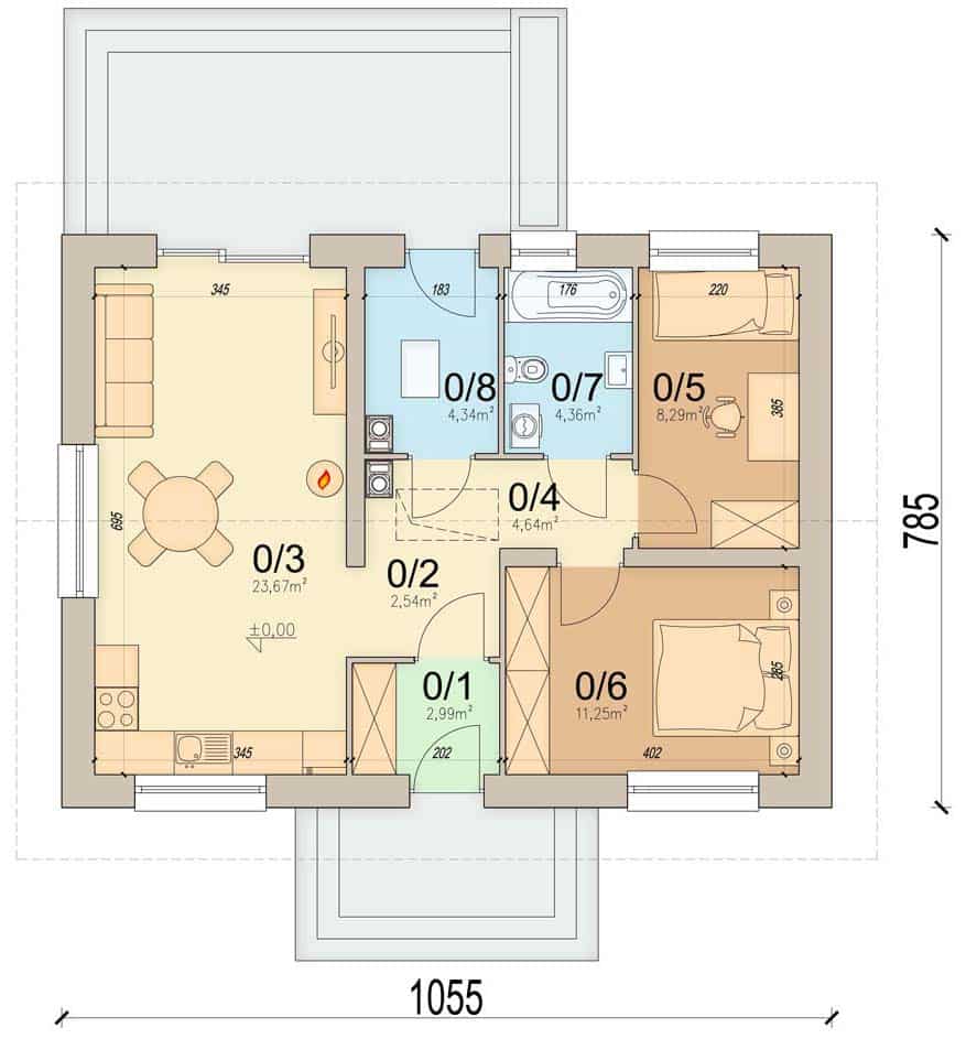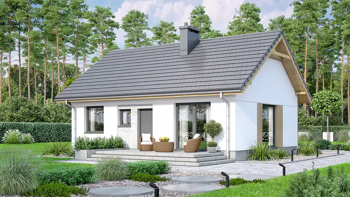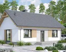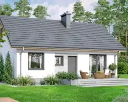 Nektarynka ist ein Entwurf für ein kleines einstöckiges Haus. Dank seiner sehr einfachen Form ist es kostengünstig und leicht zu bauen. Trotz seiner geringen Größe verfügt das Haus über ein großes Wohnzimmer mit Platz für ein Esszimmer, eine praktische Küche und zwei komfortable Zimmer. Im Windfang ist Platz für einen großen Kleiderschrank vorgesehen. Um den Dachbodenraum zu nutzen, wurde eine klassische Holzdecke mit einer Öffnung für eine ausziehbare Treppe entworfen. Ein weiterer Vorteil des Entwurfs ist der Hauswirtschaftsraum mit direktem Zugang zum Garten. Das Gebäude wurde mit einer Festbrennstoffheizung und zusätzlich mit einer Gasinstallation für diejenigen ausgestattet, die eine Gasheizung nutzen möchten. Bei der Erstellung des Entwurfs Nektarynka wurden energieeffiziente Lösungen verwendet, die niedrige Betriebskosten gewährleisten.