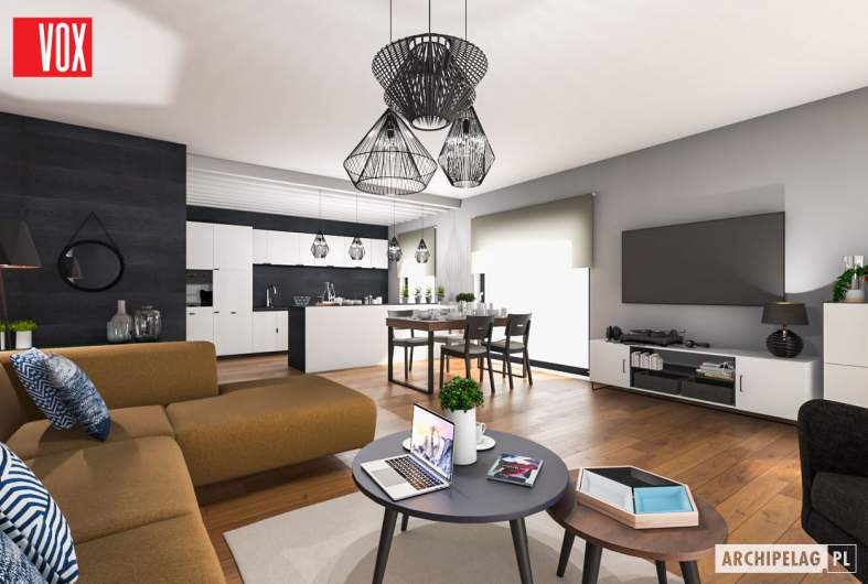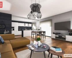 Im Wohnbereich befindet sich eine offene Küche, neben der eine praktische Speisekammer geplant ist. Sie wird durch ein 34,14 m² großes Wohnzimmer erweitert. Vom Wohnzimmer aus gelangt man auf die Terrasse, die selbst den anspruchsvollsten Investoren gefallen wird. Einige behaupten, dass dies einer der größten Vorteile des Entwurfs Simon IV G2 ist!