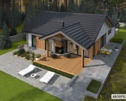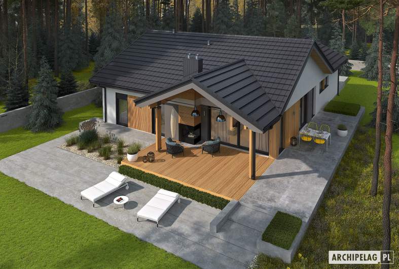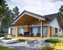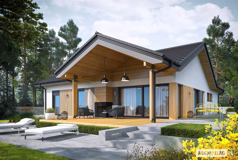 Die einzigartige, große Terrasse im Entwurf des Hauses Simon IV G2 verfügt über eine moderne Überdachung, die sich unter anderem bei schlechtem Wetter als nützlich erweist, wenn wir uns im Freien entspannen möchten. Auf den dargestellten Visualisierungen ist ein Beispiel für die Gestaltung der Terrasse zu sehen. Eine weitere, von Investoren häufig genutzte Möglichkeit ist es, einen Tisch und Stühle im Freien aufzustellen, um Mahlzeiten im Freien einzunehmen (diese Option eignet sich besonders in den Sommermonaten).