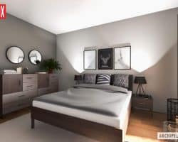 Im Projekt Simon IV G2 wurde auf die Aufteilung in einen Wohn- und einen Schlafbereich geachtet. Beginnen wir jedoch von vorne. Der Eingangsbereich des Hauses verfügt über ein kleines Vordach. Durch dieses gelangen wir in den Windfang, auf der linken Seite befinden sich der Heizungsraum und die Garage, in der auch Fahrräder, Heimwerkerwerkzeuge oder Gartengeräte Platz finden. Im hinteren Teil des Gebäudes befinden sich drei Schlafzimmer sowie zwei allgemein zugängliche Badezimmer und eine Toilette.