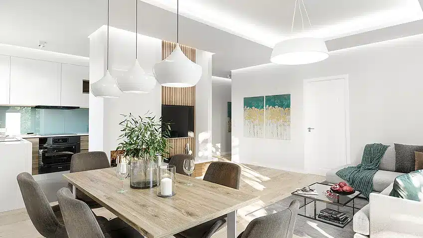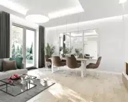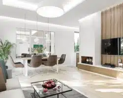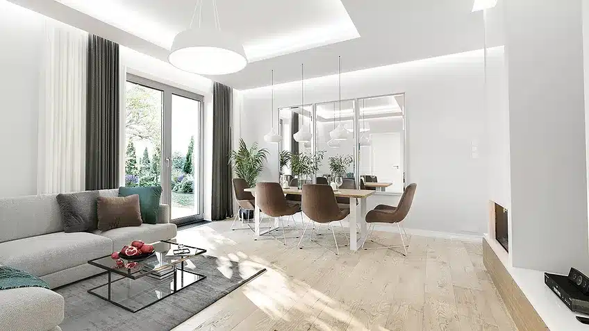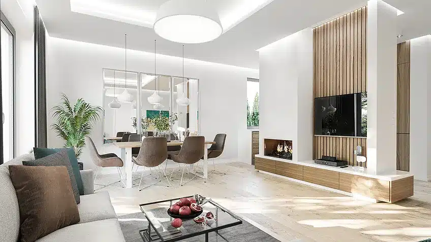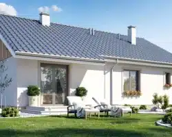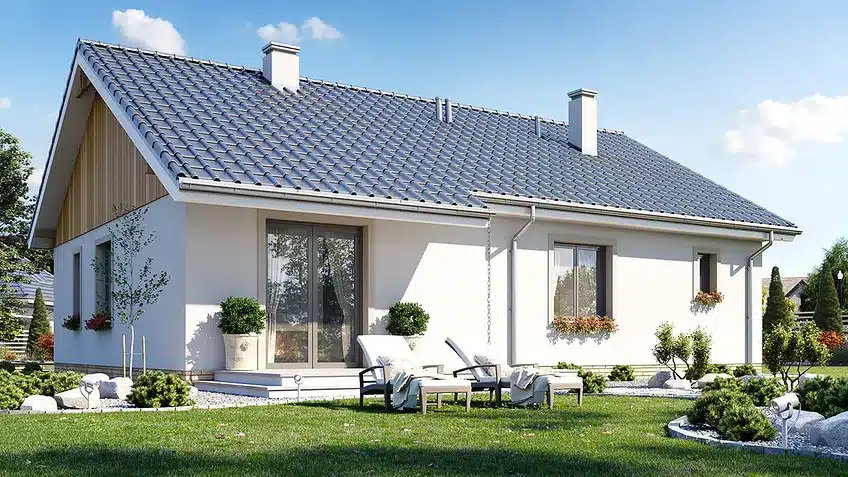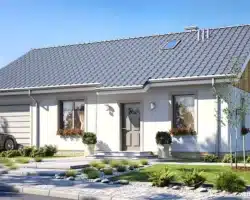 Dieses Projekt hat eine einfache und unkomplizierte Form und Konstruktion. Dank seiner sparsamen Form und seiner Einfachheit ist es leicht zu bauen und daher kostengünstig. Gleichzeitig ist es funktional und erfüllt zu hundert Prozent die Anforderungen an ein komfortables Wohnen für eine vierköpfige Familie. Man betritt das Haus durch einen Vorraum mit einem großen Kleiderschrank, der zum Flur und zum Wohnzimmer führt. An den Seiten, unweit des Eingangs, befinden sich die Kinderzimmer, weiter hinten liegt der Wohnbereich – mit einer durch eine Kamin- und Fernsehwand abgetrennten Küche und einem Wohnzimmer mit einer Sitzecke und Platz für einen Esstisch. Weiter hinten befindet sich das etwas vom Rest des Innenraums abgetrennte Elternschlafzimmer. Vom Flur aus gelangt man über einen kleinen Korridor zum Badezimmer und WC und weiter hinter einer Doppeltür zur Garage und zum Heizungsraum. Der Entwurf des Hauses Zosia 6 ist angesichts der geringen Nutzfläche sehr funktional und verfügt über ein umfangreiches Raumprogramm. Hier gibt es keinen verschwendeten Raum – alles ist logisch und praktisch angeordnet. Das Haus hat ein schlichtes und ansprechendes Design. Ein entscheidender Vorteil dieses Hauses ist seine Einfachheit und Funktionalität, die sich in einem maximalen Investitionsergebnis für wenig Geld niederschlagen.