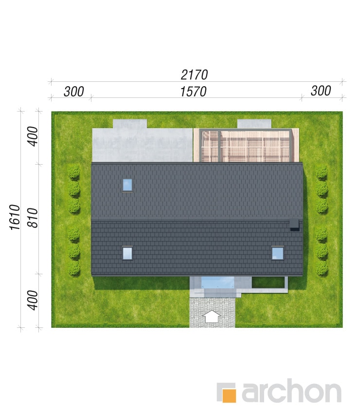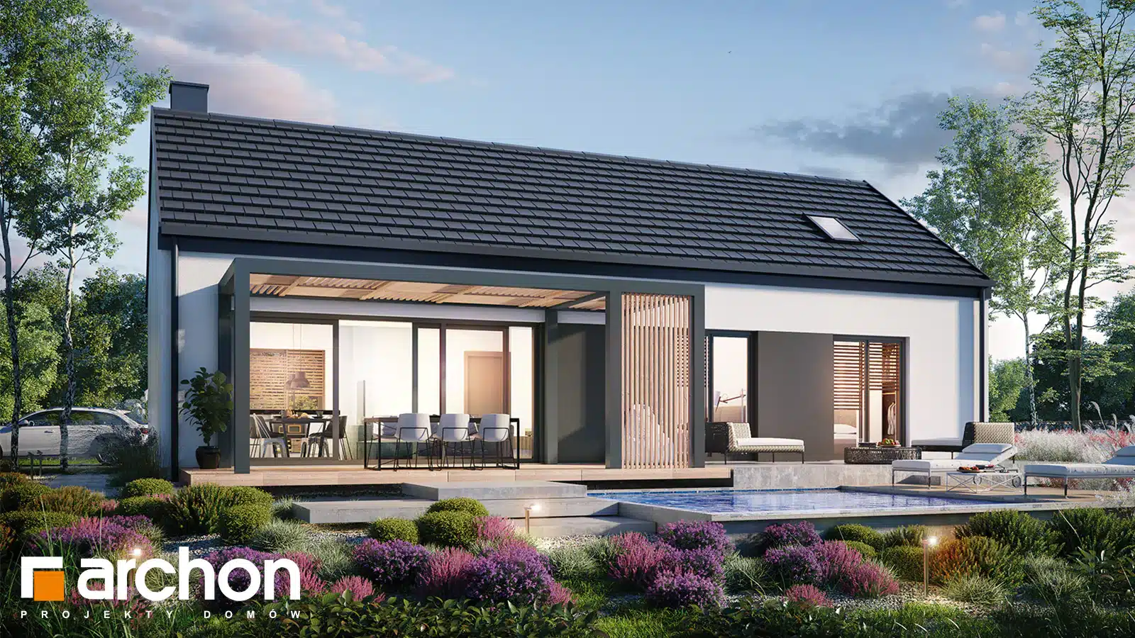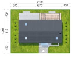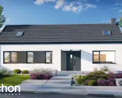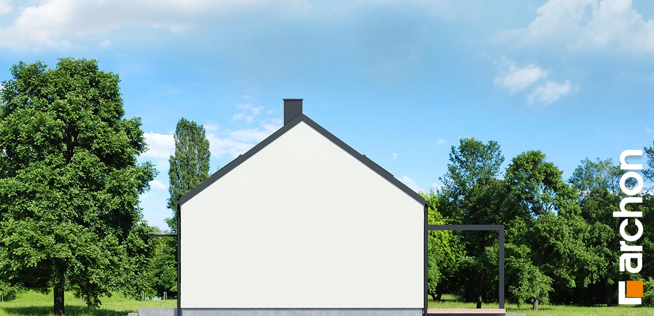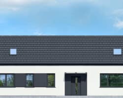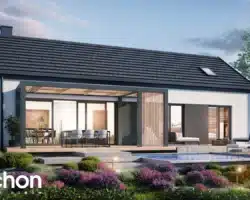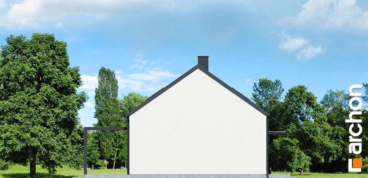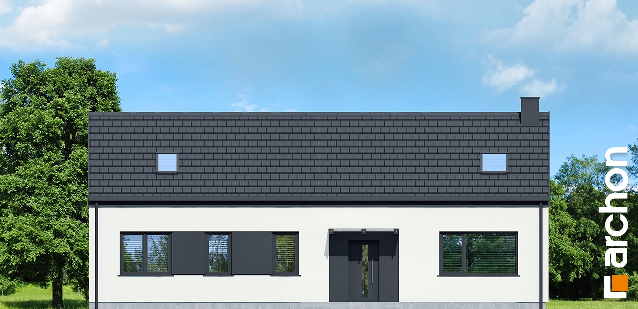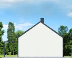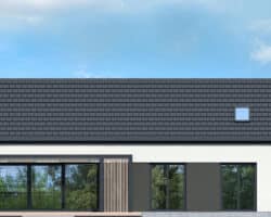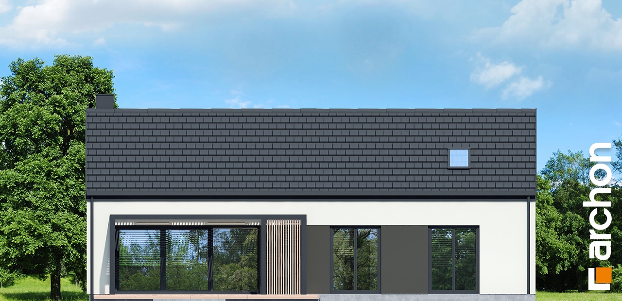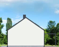 The simple, modern structure is crowned by a roof without an overhang, whose anthracite-colored roofing harmonizes perfectly with the white and gray plaster of the façade. The transparent canopy over the entrance protects the area from rain, and the pergola over the terrace on the garden side invites you to relax in the pleasant shade. A spacious vestibule leads us into the hallway, which clearly separates the private part of the house from the living area. The open ceiling up to the roof above the living and dining room gives this area a feeling of spaciousness, and the optimally arranged windows and the exit to the spacious terrace provide attractive lighting for the interior with natural light. The kitchen has an island with a breakfast bar and a pantry. Thanks to the impressive fireplace, the family can relax in the evenings in a warm atmosphere and cozy mood. Near the sunny area of the house, there is also a toilet and a boiler room, which are accessible from the hallway. The night area comprises two children’s rooms, one of which has a dressing room, the master bedroom, also with its own dressing room, and a bathroom with a bathtub and shower. The rooms on the garden side are connected to the outdoor area, which makes the space easier and more attractive to use.
