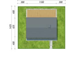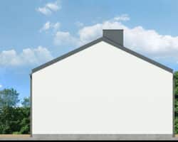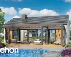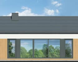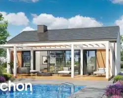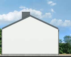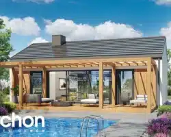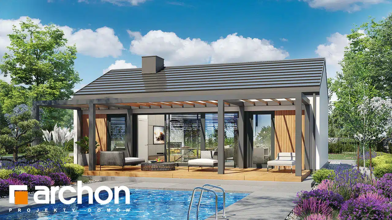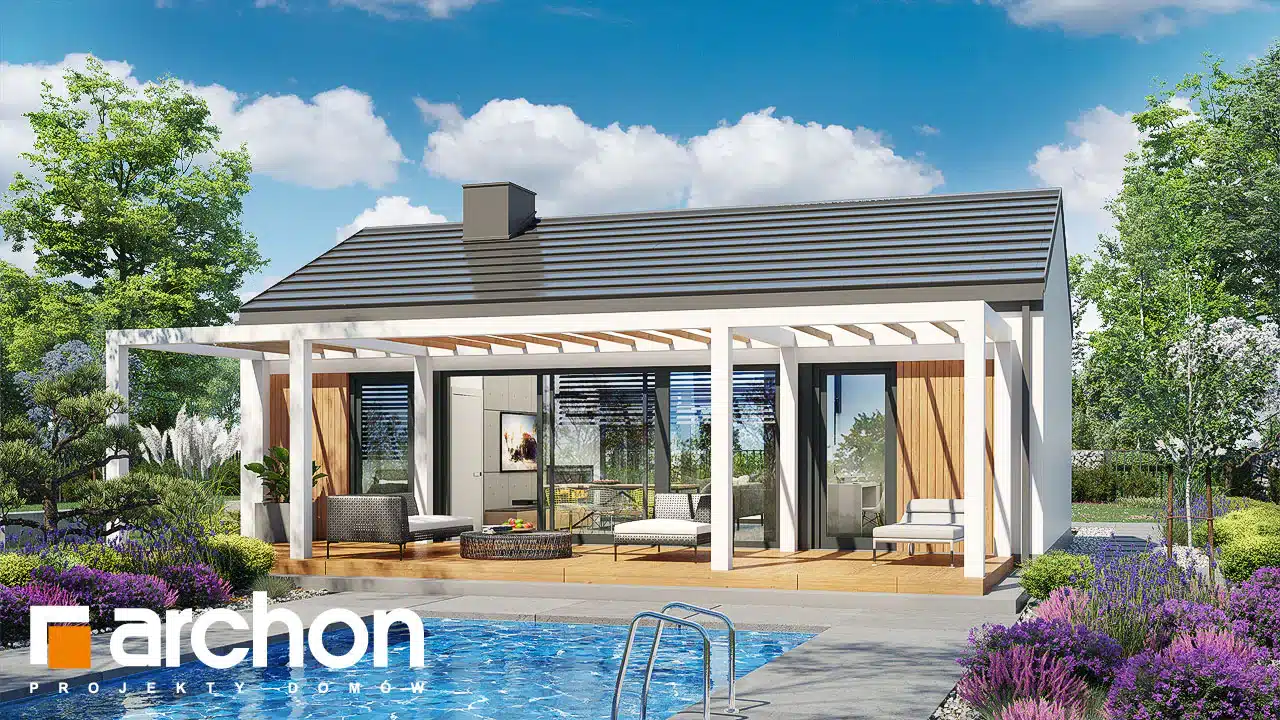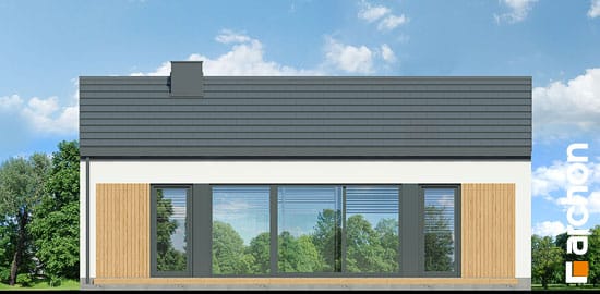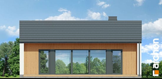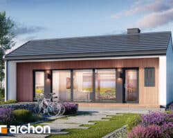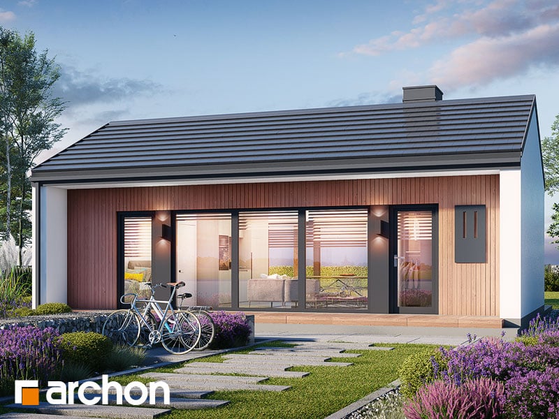 An interesting house project that is ideal as a leisure residence outside the city. Thanks to the use of suitable functional solutions, the small interior space is comfortable to use. The simple structure in the style of a modern barn is in line with current trends. With its light-colored plaster and wood paneling, the house looks very attractive and blends harmoniously into the natural landscape. The middle part of the building is taken up by a beautifully lit living area that opens up to nature on two sides. The living area includes a cozy living room with a fireplace, a kitchenette, and a dining area with a large table. On both sides of the living area are private rooms, including two children’s rooms and the master bedroom. Each of these rooms has space for comfortable beds and has its own exit to the garden. The vestibule leads to a bathroom with a modern shower.
