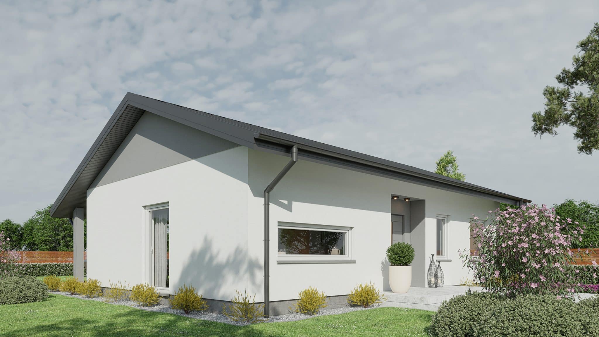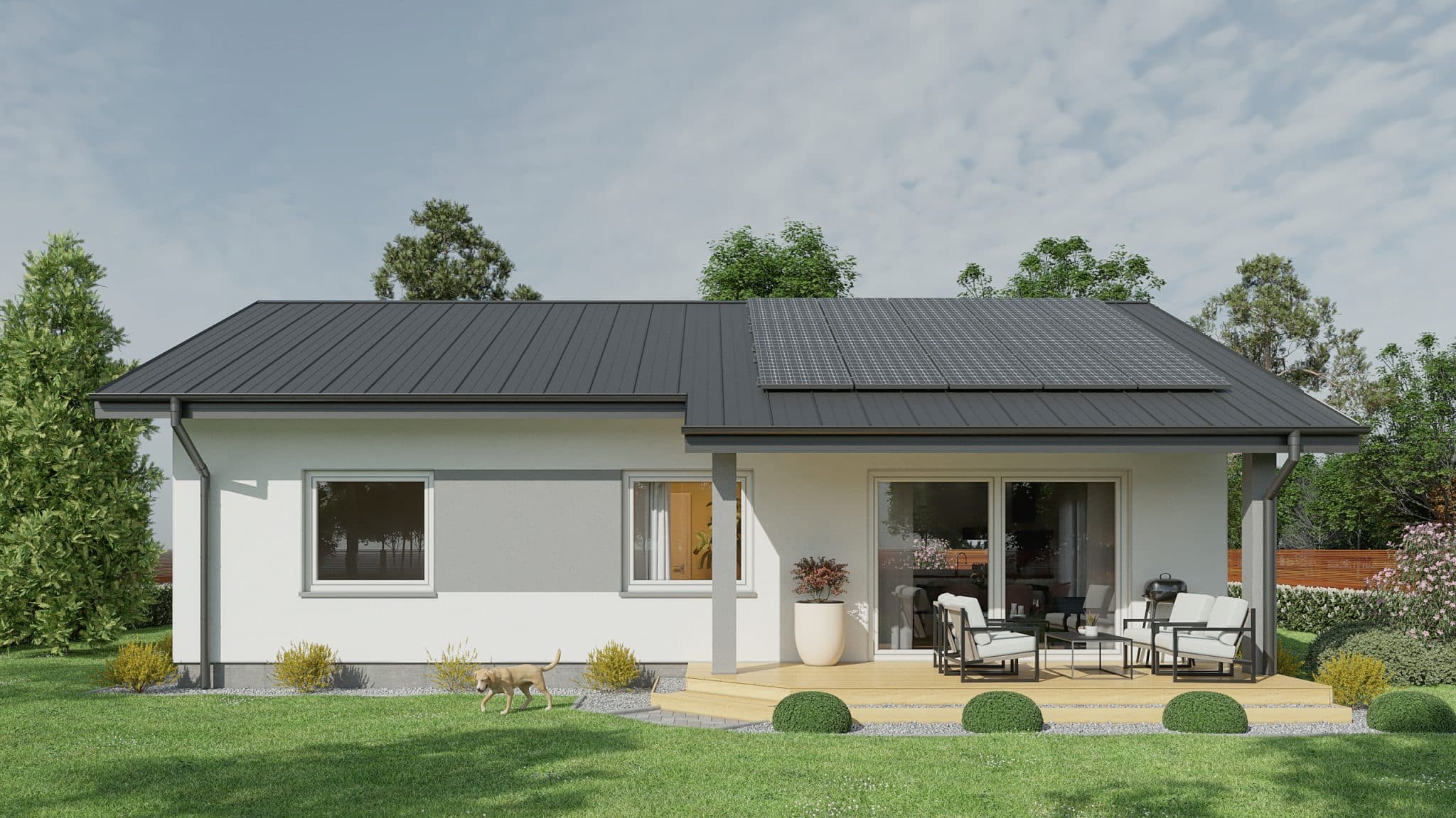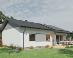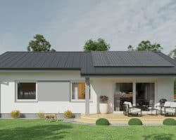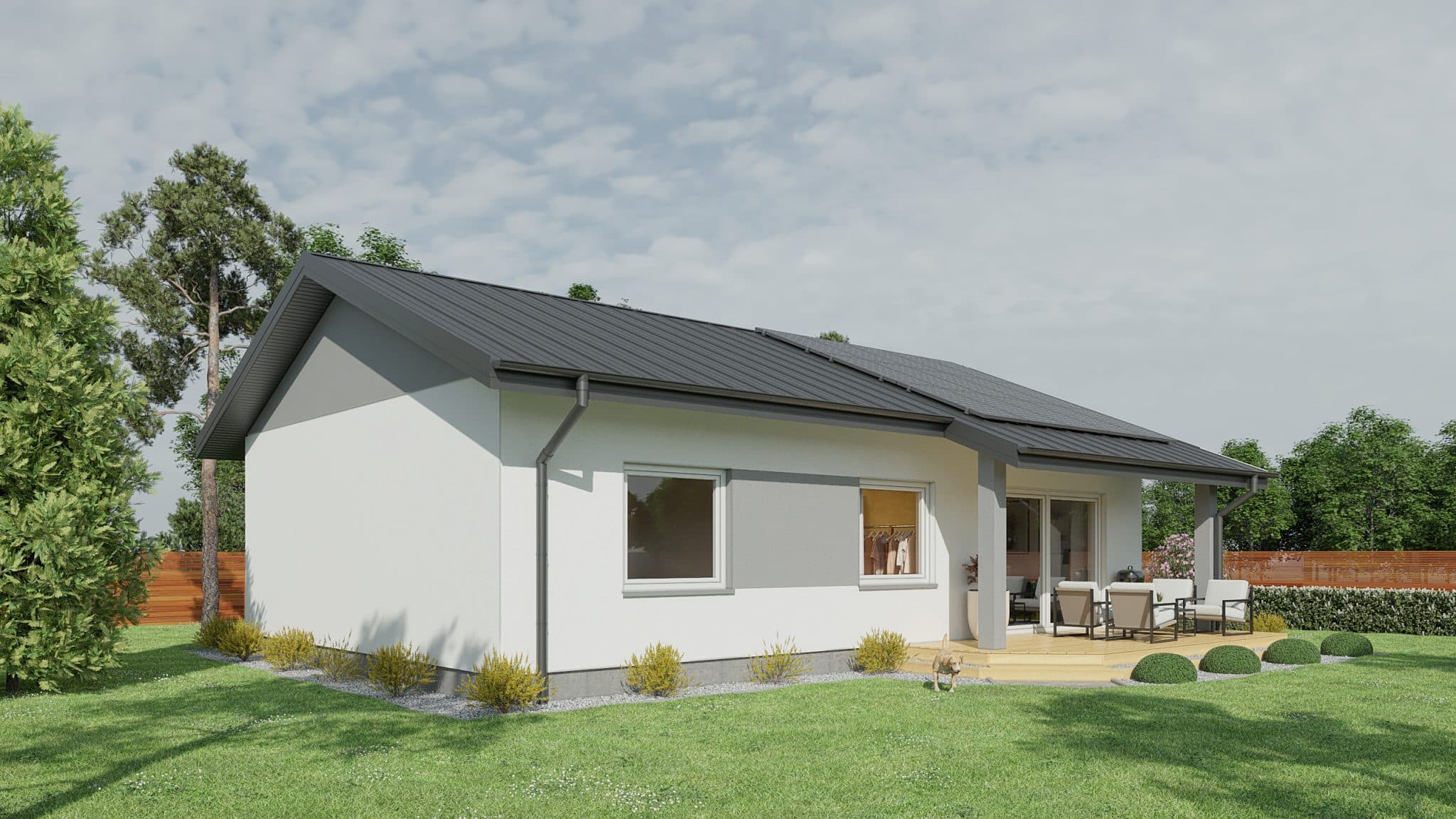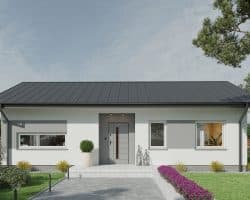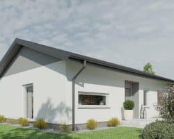 The 82.5 m² Little One house is the ideal solution for families looking for comfort and functionality in a compact form. This project combines modern architectural solutions with a cozy character, creating an ideal place to live. The building is characterized by a simple shape and a gable roof, giving it a classic, aesthetic appearance. Despite its small area, it offers a well-thought-out room layout that maximizes the usable space and comfort of its residents. In addition, the house has space for a terrace, creating additional space for outdoor relaxation. The garden is accessible through large sliding doors, which provide easy access to the outdoor area and allow you to enjoy the garden directly from the living room.