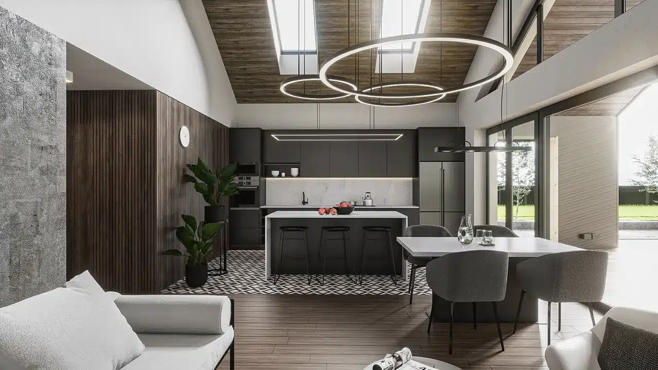 The spacious living room, connected to a generous kitchenette and dining area, forms a harmonious whole.