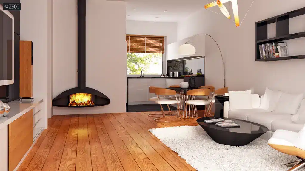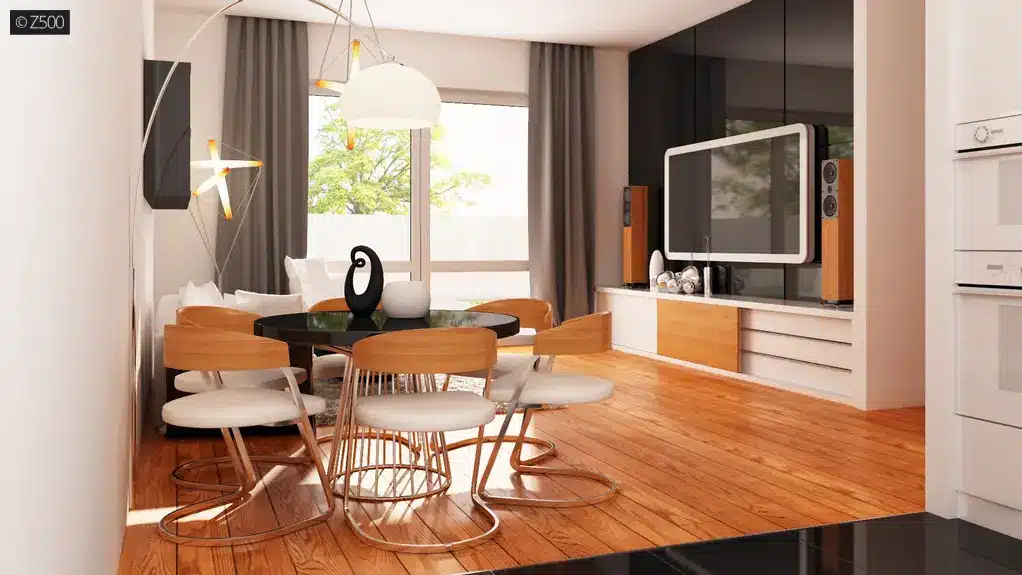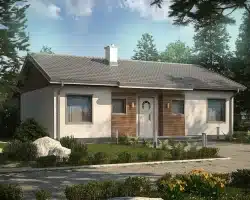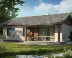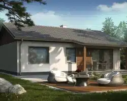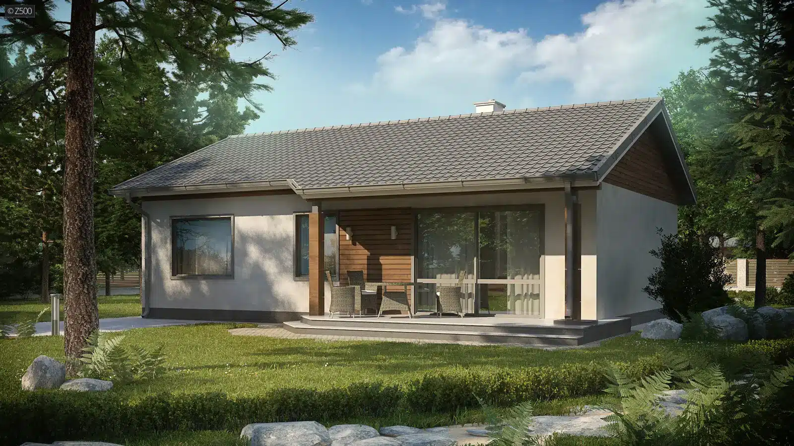 The Z7D project is a small and inexpensive single-story house with a gable roof. Its simple, modern design allows for quick and economical construction. The façade is enhanced by wooden elements, which lend it additional charm and thus increase its aesthetic value.